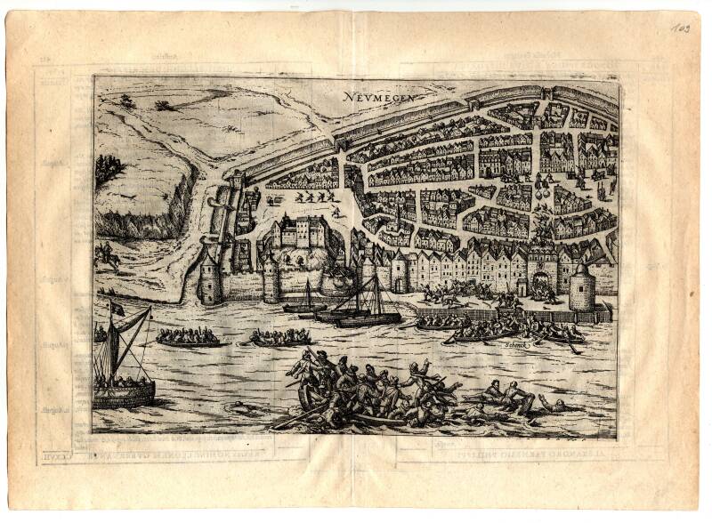 Original copper engraving of Nijmegen by F. Hogenberg and G.Braun, map originated from Civitas Orbis Terrarum 1599. Failed attack on Nijmegen in 1589. Maarten Schenck drowns in the river Waal, on Handcrafted paper, text on verso (latin). sheet size: 27.2 x 26.6 cm. print size: 28.4 x 19.3 cm. Own coll.